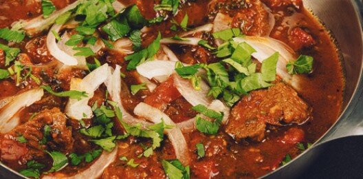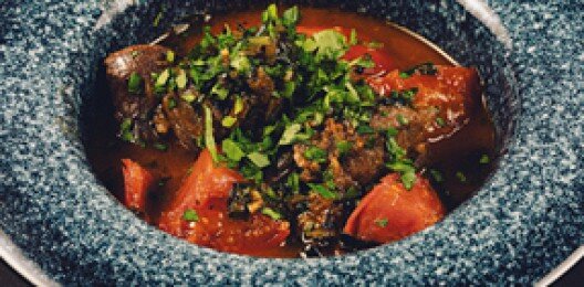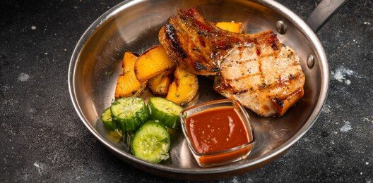 Жеребятина на ребре, обжаренная на углях, подаётся с соусом из томатов и хрена
