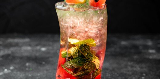 Мята, лайм, минеральная вода, сироп сахарный, лёд