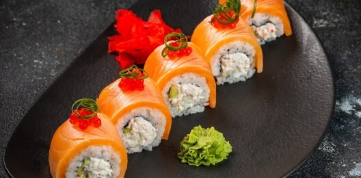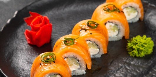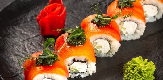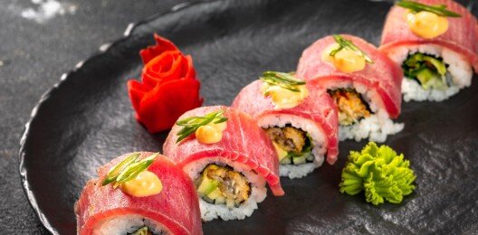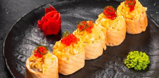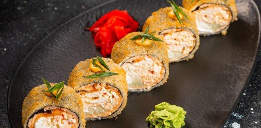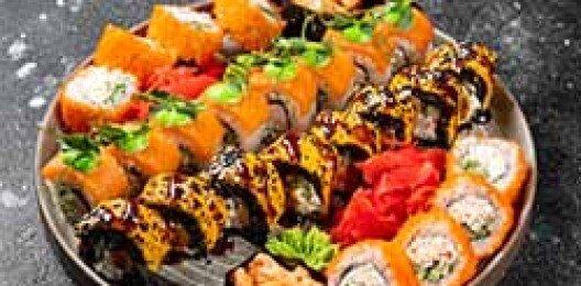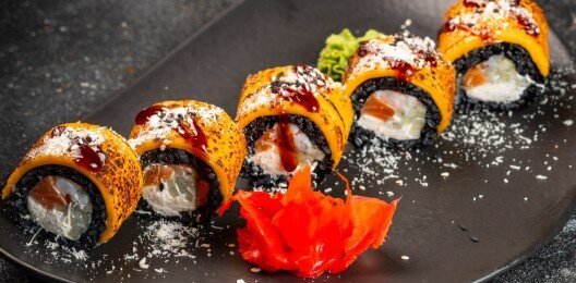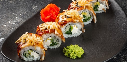 Авокадо, угорь, дайкон, пай, соус спайси, омлет