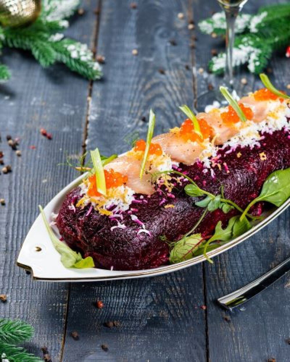 Классическая версия салата под-шубой, приготовленная из печёных овощей, атлантической сельди и заправленный соусом айолли